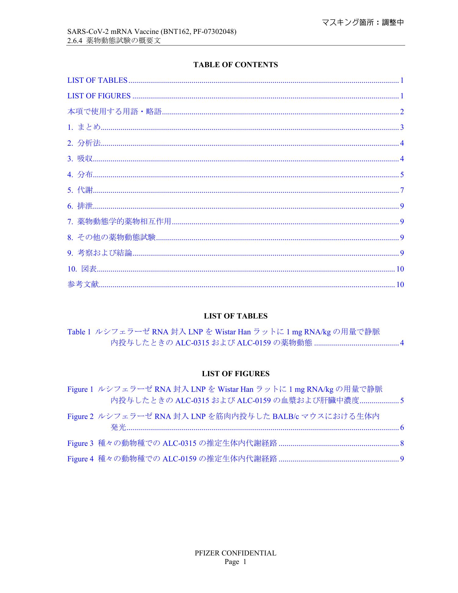 「日本の当局から流出した」というファイザー社の動物試験「非公開」文書 SARS-CoV-2 mRNA Vaccine (BNT162, PF-07302048) 2.6.4 薬物動態試験の概要文 Pfizer report_Japanese government.pdfSARS-CoV-2 mRNA Vaccine (BNT162, PF-07302048) 2.6.4 薬物動態試験の概要文. マスキング箇所:調整中. TABLE OF CONTENTS LIST OF TABLES .............