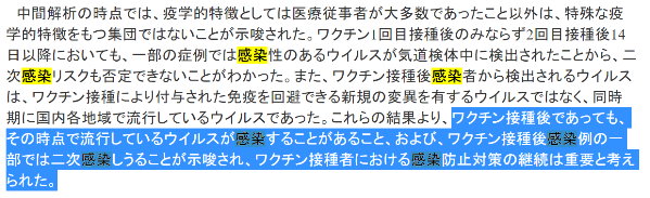 ワクチン接種後であっても、その時点で流行しているウイルスが感染することがあること、および、ワクチン接種後感染例の一部では二次感染しうることが示唆され、ワクチン接種者における感染防止対策の継続は重要と考えられた。