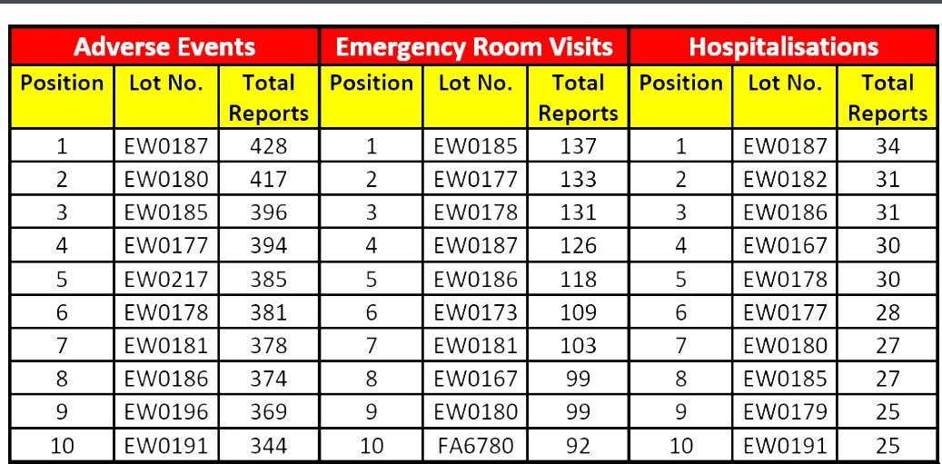かねがね陰謀論として言われていた、コロナワクチン死のロット。 もはやコロナウイルスの感染予防効果はなく、死刑執行。 運が良ければ助かるが、追加接種でリスクは高まる。 それでも医者は儲かるので接種を勧めるだけ。打ちたい方は、アタリが出るまでどうぞ。 . 20個に1個のバッチが、死傷者の大半を生み出していた。品質、管理状況、保存状態、など短期的な理由により「劣化」する場合があるが、極悪ロットに偏よりがあることはデータで証明された。さ、お試しあれ。 https://peterhalligan.substack.com/p/are-you-happ
