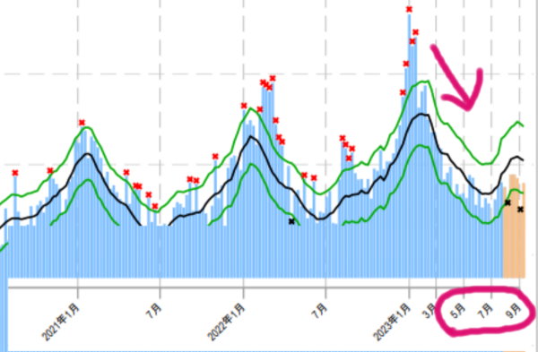 マスクし消毒しワクチン打って、最悪の超過死亡を記録した日本。 2類から5類にしたら大変なことになる! はずが、超過死亡はダダ下がりの現実。 感染対策が逆効果だっという納得できる結果に。 もっとも前年に死ぬ過ぎて、反動で減ったなんてのもあるかもしれません。 なんにせよ、感染対策なんて辞めた海外はとっくにコロナは終わってるし。 そう考えると、日本で行っていたコロナ対策は逆効果とも言える失敗だったわけです。 それよりも深刻なリスクは、mRNAコロナワクチン接種。   免疫低下に発がんリスクも明らかになった薬害ワクチン。 世界一接種してしまった日本では、本当のリスクはこれからなのかもしれません。   5類で超過死亡が減少 関東のデータ。見やすく中間をカットした画像。 赤丸の部分が2類から5類への変更時期。