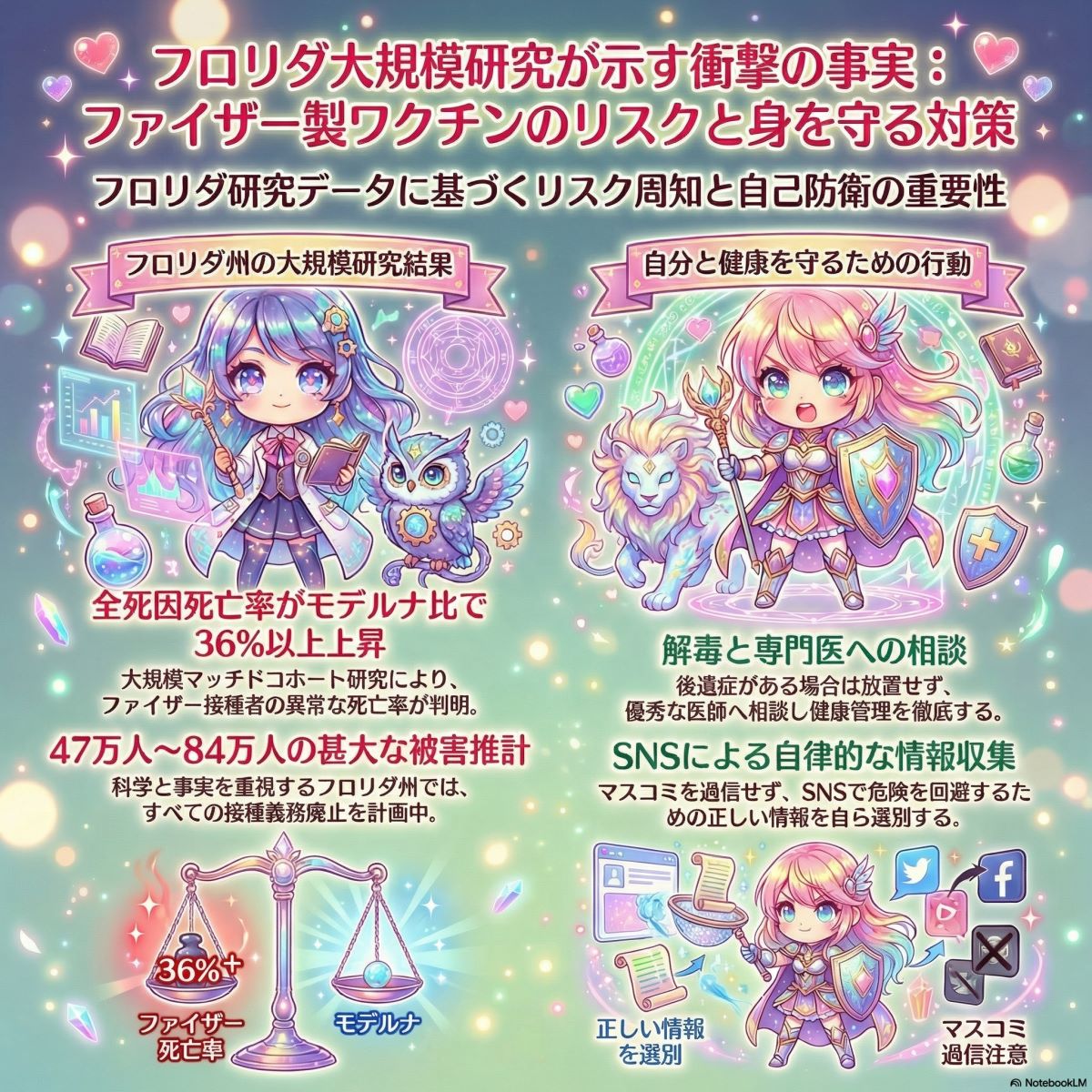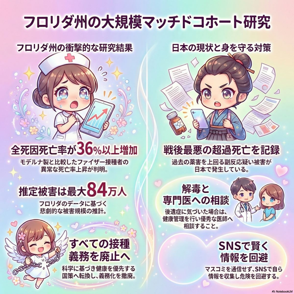 フロリダ州の保健総監ジョセフ・ラダポ氏の研究を基に全米に外挿した結果で、ファイザー接種者はモデルナ接種者に比べて全死因死亡率が36%も高かったそうです。