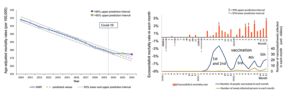 2021年には1回目と2回目のワクチン接種による集団ワクチン接種後にがんによる過剰死亡がある程度観察され、すべてのがんと一部の特定の種類のがん(卵巣がん、白血病、前立腺がん、口唇がん、口腔がん、口腔がんなど)で有意な超過死亡が観察されました。 2022年に3回目の集団ワクチン接種が行われた後、咽頭がん、膵臓がん、乳がん)が発生した。死亡者数が最も多かった4つのがん(肺、結腸直腸、胃、肝臓)のAMRは、パンデミックの最初の年まで減少傾向を示したこの研究では、年齢調整後のがん死亡率の増加について考えられる説明について議論しています。
