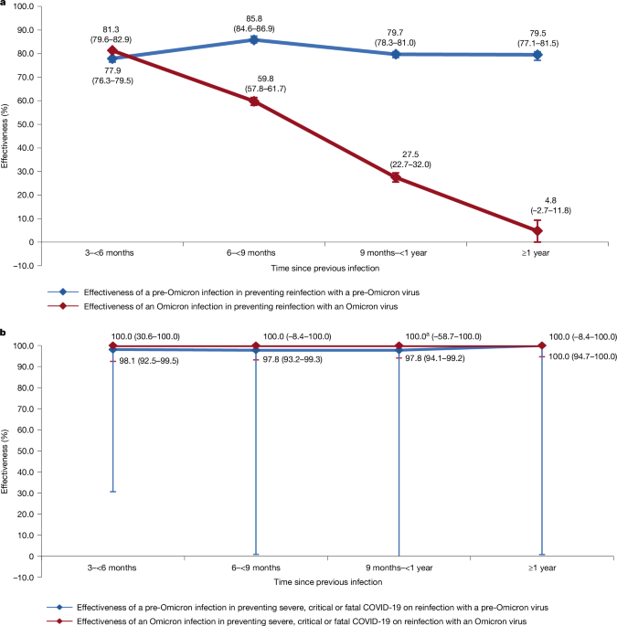 オミクロン感染は再感染の感受性を高めます。(ワクチン接種を受けた個人の場合) 新しい研究では、オミクロン感染が1年後の再感染を防ぐ効果を推定しました。 未接種者における有効性: 25.9% ワクチン接種における有効性: -1 .2%