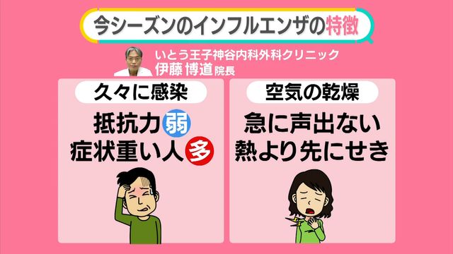 「(新型)コロナが猛威を振るっていた時はインフルエンザの数は少なかったんですが、伊藤院長によると久々に感染して抵抗力が弱まっていると症状が重く出る人が多いということです。強い頭痛などを伴うこともあるといいます」
